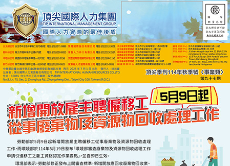 ◎ 5月9日起,新增開放雇主聘僱移工從事廢棄物及資源物回收處理工作 ◎ 農業移工聘僱恐錯過季節_農業部長:希望勞動部獨立審查 ◎ 勞動部修正一般營造業移工招募規定 ◎ 旅宿業缺工超過5千人_觀光署:爭取放寛外籍移工身分、期限延長 ◎ 雇主/勞工請假薪資懶人包 ◎新型詐騙手法正流行!別分享你的螢幕