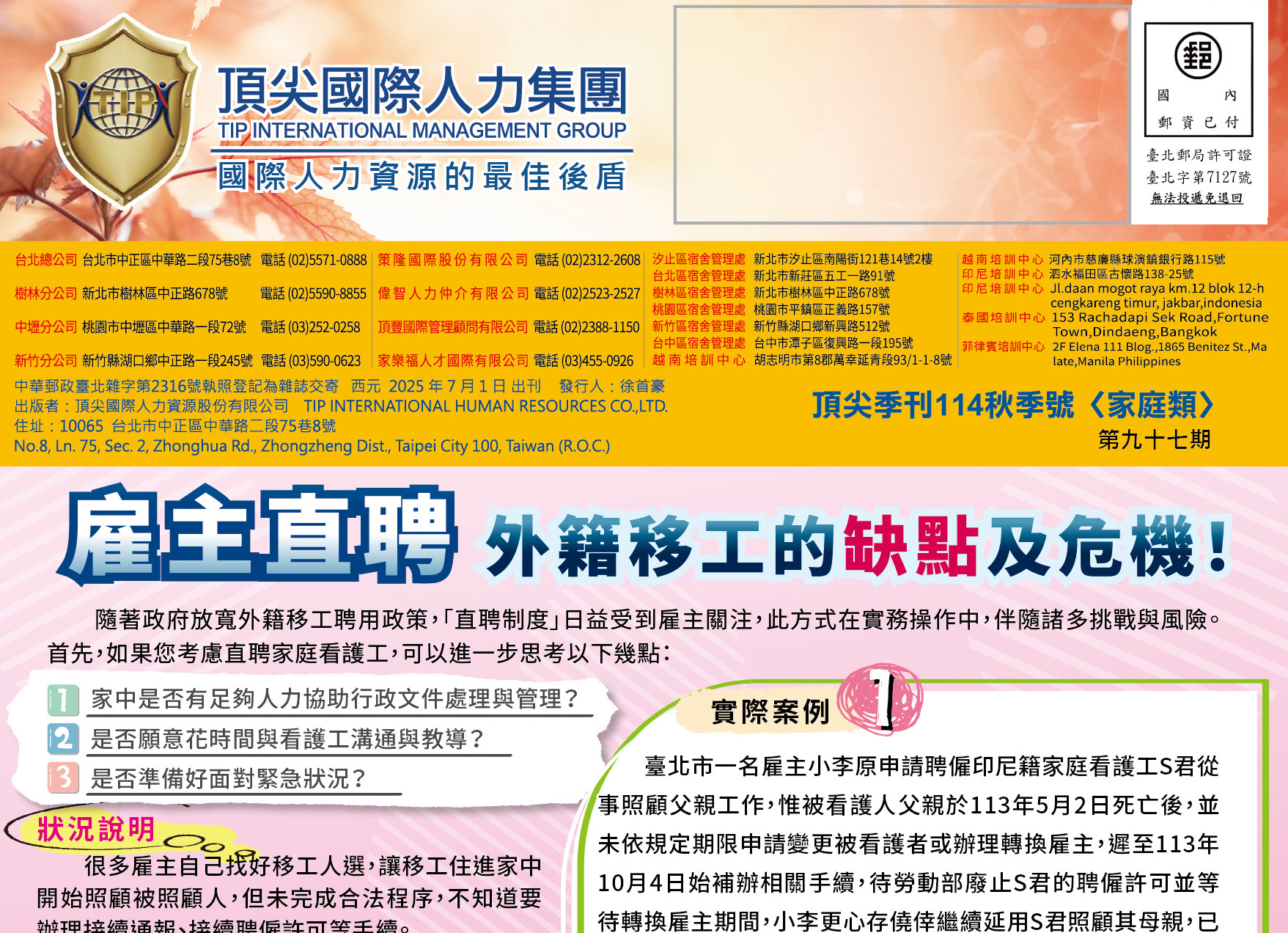 ◎ 頂尖人力集團 徐首豪董事長榮任全國性人力仲介協會理事長,目標:強化外籍看護照顧品質 ◎ 80歲免評聘外看護工-仍需再等等◎ 移工懷孕主不可解聘!勞動部訂移工婦幼權益保障指引 確保勞雇權益 ◎ 鐘點移工計畫6家評選單位出爐 3月底正式上路 ◎ 人口販運預防,扣留身分證明文件乃非法行為 ◎ 東聯互動攜手一卡通,4國移工匯款開通「手機線上匯」 ◎ 網路個資保護宣導