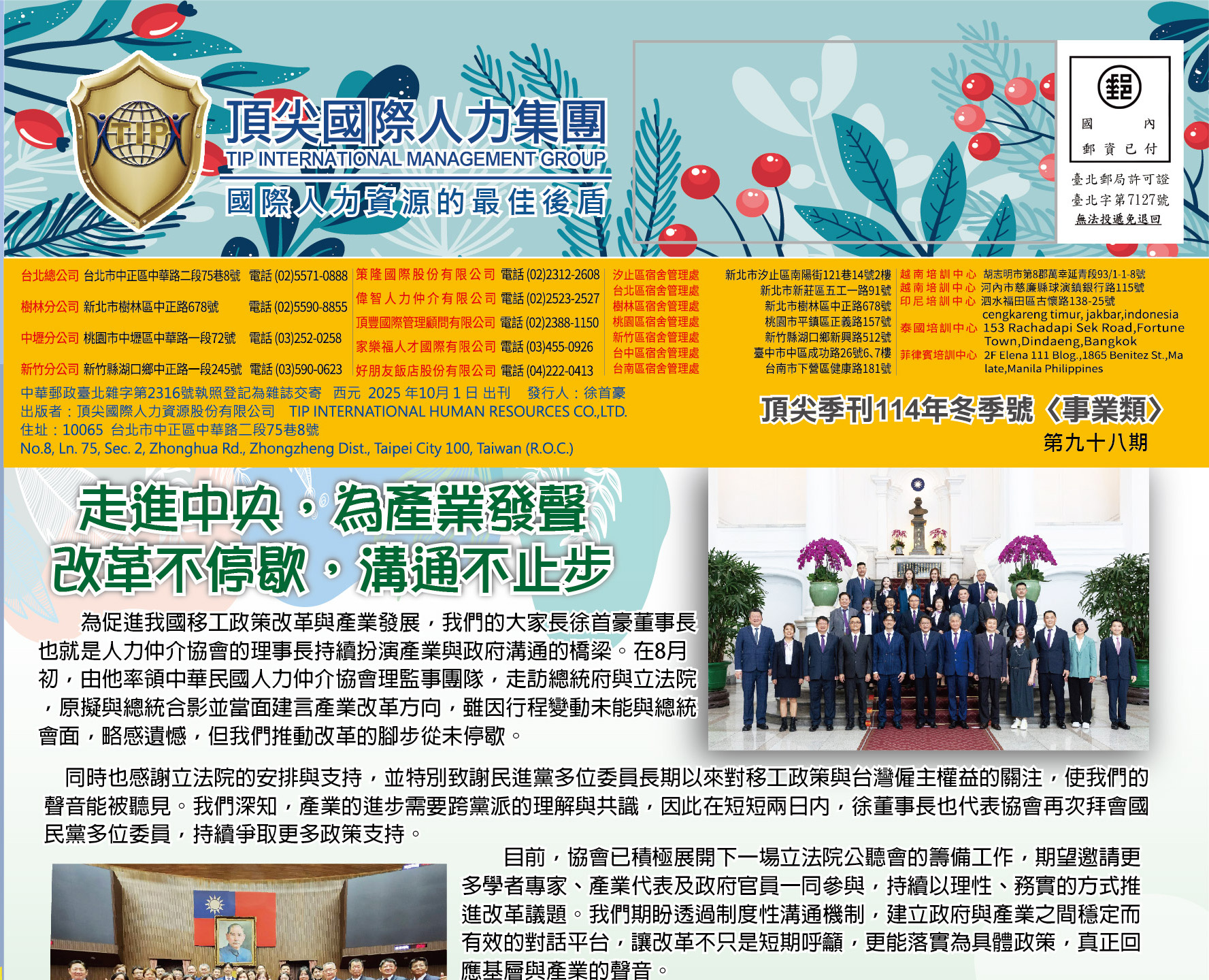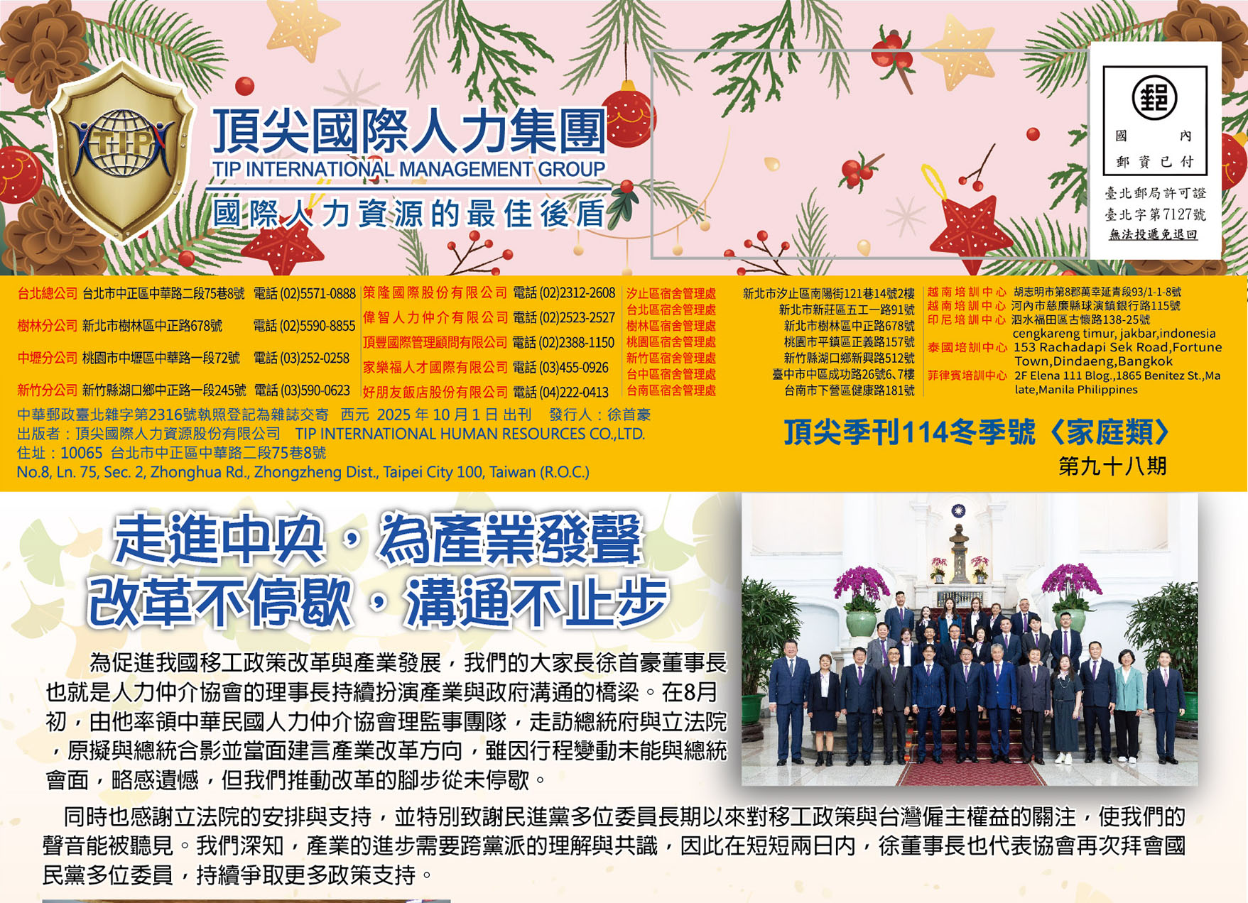 ◎走進中央, 為產業發聲-改革不停歇, 溝通不止步 ◎ 頂尖公司強化RBA專業能力,共築永續競爭優勢 ◎ 回台要注意!攜帶電子煙是違法行為 ◎政院通過職安法修法,雇主接獲霸凌申訴須通報 ◎印尼辦事處認證文件費用調整通知 ◎115年1月1日起 育嬰留停「日」請、家庭照顧假以「時」請 ◎帳戶半年未使用餘額又低 當心被列為「靜止戶」暫停線上提款功能