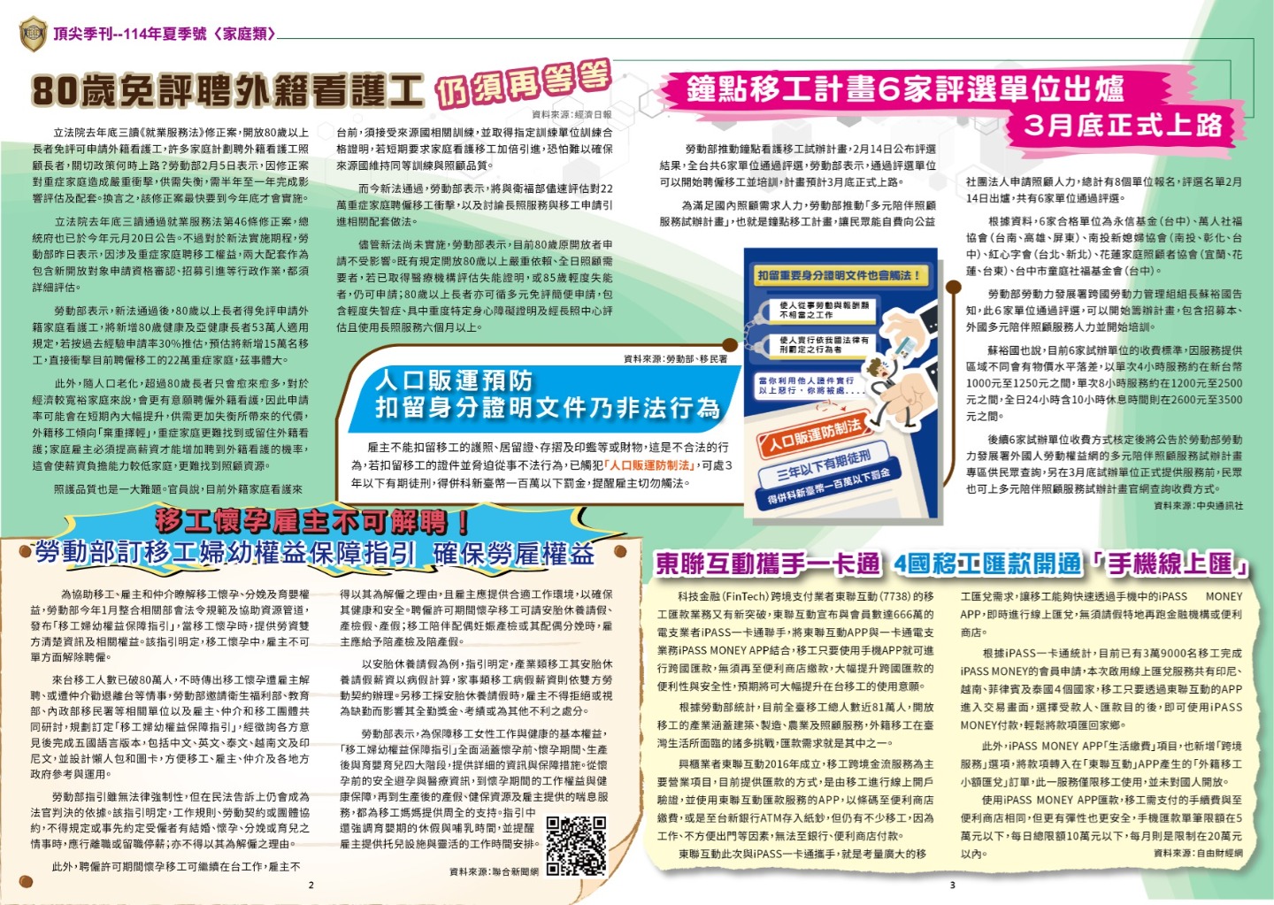 ◎ 頂尖人力集團 徐首豪董事長榮任全國性人力仲介協會理事長,目標:強化外籍看護照顧品質 ◎ 80歲免評聘外看護工-仍需再等等 ◎ 移工懷孕主不可解聘!勞動部訂移工婦幼權益保障指引 確保勞雇權益 ◎ 鐘點移工計畫6家評選單位出爐 3月底正式上路 ◎ 人口販運預防,扣留身分證明文件乃非法行為 ◎ 東聯互動攜手一卡通,4國移工匯款開通「手機線上匯」 ◎ 網路個資保護宣導
