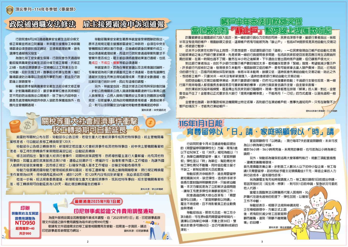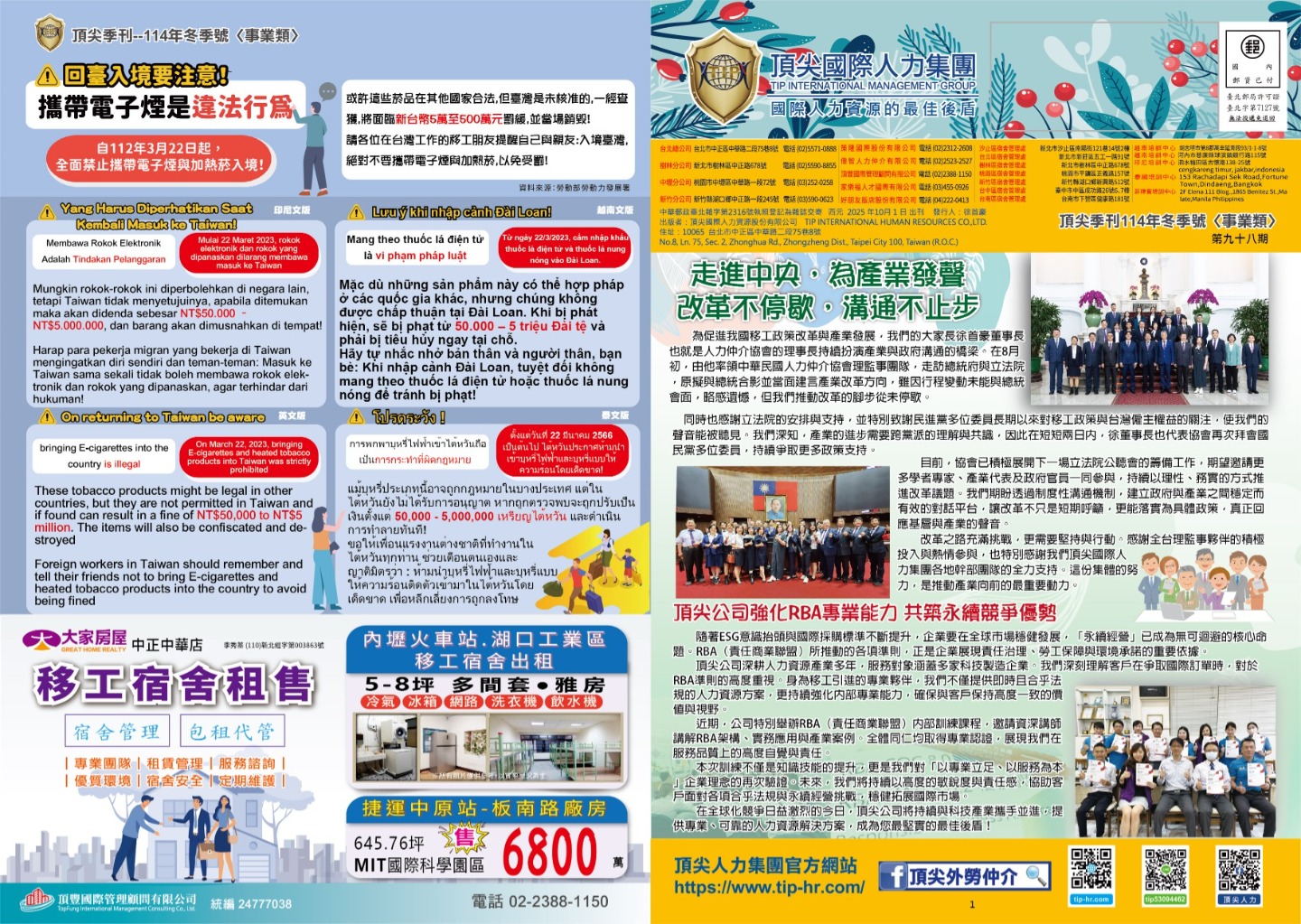 ◎走進中央, 為產業發聲-改革不停歇, 溝通不止步 ◎ 頂尖公司強化RBA專業能力,共築永續競爭優勢 ◎ 回台要注意!攜帶電子煙是違法行為 ◎政院通過職安法修法,雇主接獲霸凌申訴須通報 ◎印尼辦事處認證文件費用調整通知 ◎115年1月1日起 育嬰留停「日」請、家庭照顧假以「時」請 ◎帳戶半年未使用餘額又低 當心被列為「靜止戶」暫停線上提款功能